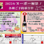 2025年10月24日 / 最終更新日時 : 2025年11月1日 yours-value 2025年ヌーボーご予約承り中です 2025年のヌーボー解禁日は11月20日(木)です! 今年もユアーズ・バリューではヌーボーの予約を受け付け始めました! 2023年リヨン杯金賞受賞 イチゴ等のアロマが豊かで、口当たりに果実の甘みをしっかりと […]