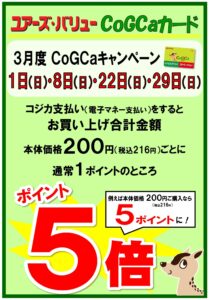 通常200円(税込216円)につき1ポイント付与しているコジカポイントをこの5日間は5倍の5ポイント付与になります!!